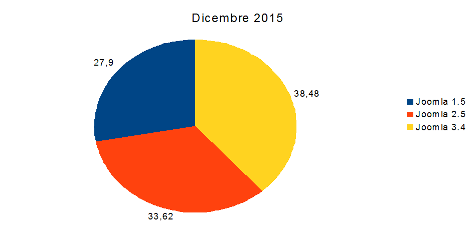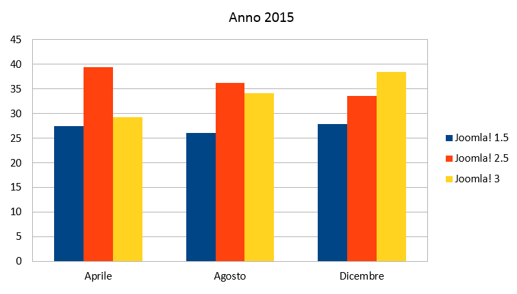 Qui di seguito trovate il grafico che mostra il trend delle versioni Joomla!® 1.5, 2.5 e 3.x per l’anno 2015 in cui si evince il lento ma costante calo della versione Joomla!® 2.5 e l’aumento della diffusione della versione 3.