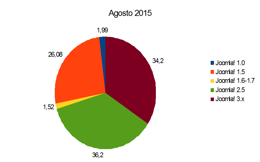 La versione 3 era in corsia di sorpasso e tra poco scopriremo insieme qual è la versione in pole position che chiude l’anno 2015. Lo scorso Agosto la versione più utilizzata, come dimostra il grafico qui sotto, era la versione 2.5 (per pochi punti percentuali) e seguiva in calo Joomla!® 1.5.