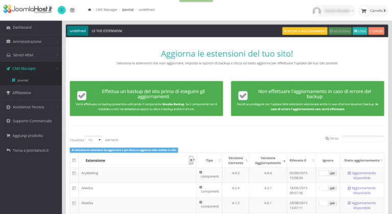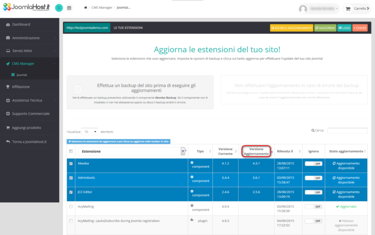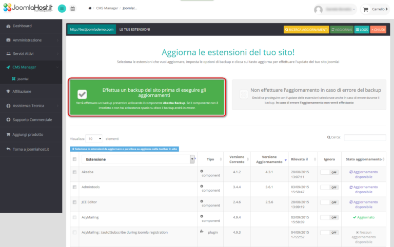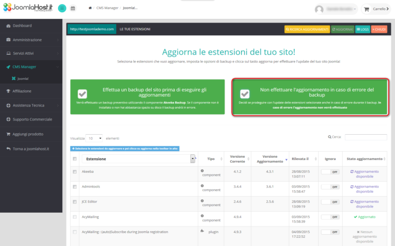 Sarai tu a decidere quali estensioni e quali siti aggiornare, quando effettuare la scansione con il CMS Manager e se effettuare un backup dei tuoi siti prima di eseguire gli aggiornamenti. Con questa nuova versione del Pannello di Controllo del CMS Manager abbiamo voluto aggiungere la libertà di scelta alla velocità di gestione degli aggiornamenti per permetterti di scegliere cosa, come e quando effettuare gli upgrade dei tuoi siti in Joomla!.
