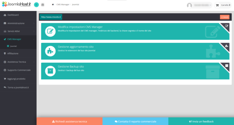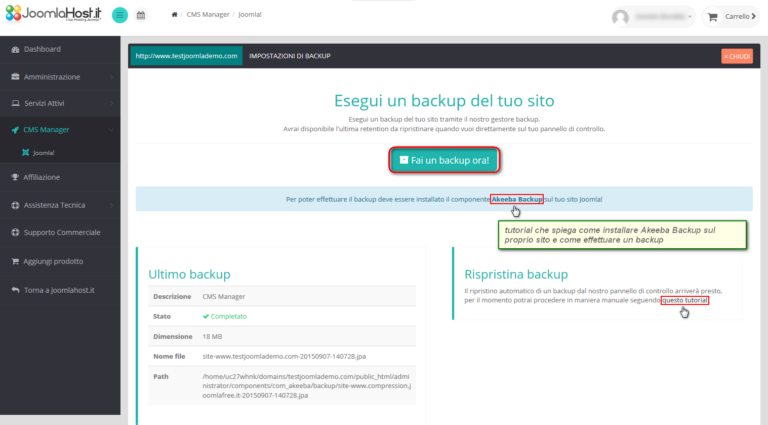 NB: ti ricordiamo che per poter lanciare il backup del tuo sito dal pannello di controllo del CMS Manager dovrai aver prima installato sul tuo sito il componente Akeeba Backup. In caso contrario il backup rimanderà un messaggio di errore e non sarà possibile effettuarlo. In questa pagina del pannello troverai anche un link al tutorial che ti spiega come installare Akeeba Backup sul tuo sito e come effettuare il backup.