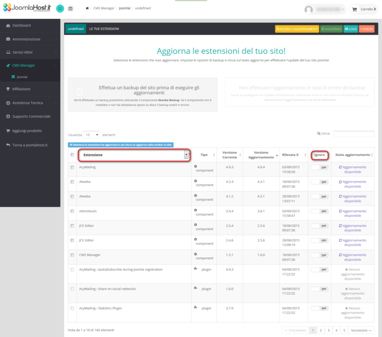 Grazie al filtro ESTENSIONI puoi facilmente individuare le estensioni che ti interessa aggiornare. Inoltre grazie alla colonna IGNORA puoi decidere di non mostrare aggiornamenti disponibili per alcune estensioni.