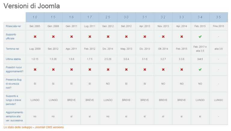 Qui di seguito vi mostriamo la tabella delle versioni di Joomla!® estratta dal sito joomla.it, in cui si evincono tutte le versioni dalla 1.0 alla futura (se uscirà) 3.5.